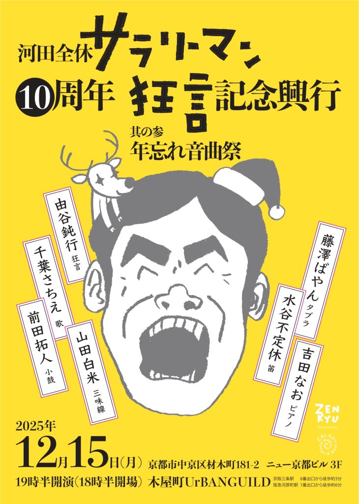 狂言師の河田全休さん主宰の「サラリーマン狂言の10周年&年忘れイベント」に、タブラ奏者として出演します。